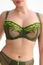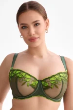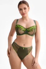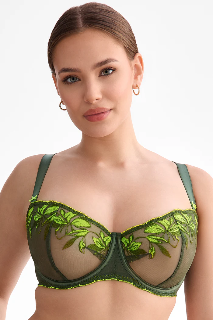 Olivia kollektsiooni tugikaartega balkonett rinnahoidja on valmistatud sügavrohelisest tüllist ja lillemotiiviga tikandist, mida täiendavad neoonse viimistlusega detailid. Korvid on ühe vertikaalse õmblusega, mis annab rinnale selge vormi ja jätab dekoltee avatuks. Keskmise kõrgusega keskosa hoiab rinnahoidja tasakaalus ning sobib hästi rõivaste alla, kus dekoltee jääb nähtavale. Küljel puuduvad lisatoestused, et rinnahoidja jääks kergem ja vähem jäik. Õlapaelad on reguleeritavad ja mitte-eemaldatavad ning kaunistatud väikeste käsitsi valmistatud lipsudega. Sõltuvalt suurusest on kinnituseks kolmerealine haak kahe või kolme haagiga.