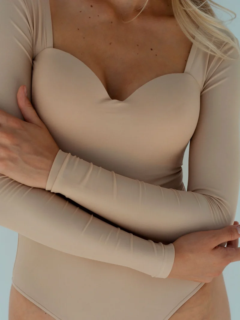 Kvaliteetsest ja vastupidavast mikrofiiberist valmistatud pikkade varrukatega bodi, millel on ühekorviline rindade toestus. Mikrokiud loob kehale kerge korrigeeriva efekti ja täiusliku istuvuse. Tänu bodi tihedale sobivusele tõstab see rinda ja loob +1 suuruse efekti ilma lisamahuta. Ideaalne lahendus igapäevaseks kasutamiseks. Toote alumine osa on valmistatud brazilian lõikega, mis rõhutab istmikku ja on riiete all nähtamatu. Kinnitus on trukkidega.