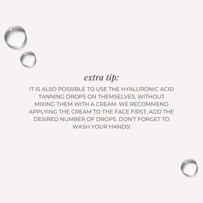 - Sega soovitud arv tilkasid oma tavapärase kreemi või seerumiga ning kanna ühtlaselt puhtale näole, dekolteele või kehale. Mida rohkem tilkasid lisad, seda intensiivsem jume tekib! Võib kasutada ka otse nahale.
