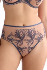 Püksid on valmistatud kaunist tikandist tormisinises toonis, mis on õmmeldud beežile alusele, luues elegantse ja naiseliku kontrasti. Sisemine jalgevahe on 100% puuvillast, tagades mugavuse ja hingavuse.
