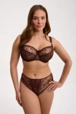 Kira Chocolate kõrge vöökohaga püksid on loodud naisele, kes hindab mugavust, elegantseid detaile ja läbimõeldud lõiget. Vöökoht ulatub nabani, pakkudes meeldivat tuge ja hoides püksid kandmisel kindlalt paigal. Esiosa on kaunistatud õrna lillemustriga tikandiga ning kergelt läbikumava võrguga, mis lisab naiselikkust ja kergust. Tagaosa on valmistatud kahekordsest, pehmest tüllist, et püksid jääksid riiete all siledad ega lõikuks istudes. Puuvillane siseosa tagab hingavuse ja mugavuse ka pikema päeva jooksul. Sügav šokolaadipruun toon rõhutab naha loomulikku ilu ja loob luksusliku, rahuliku terviku.