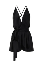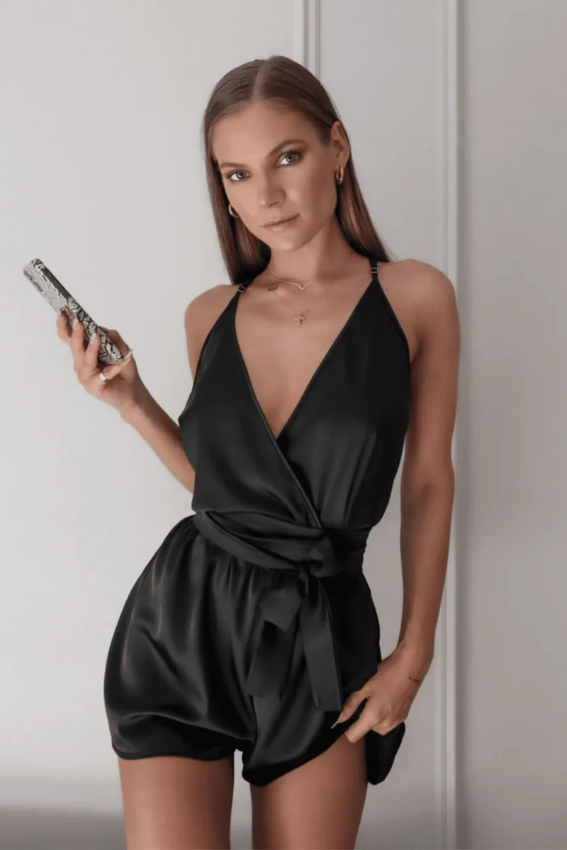 Satiinist pidžaama on loodud mugavust ja naiselikku joont silmas pidades. Vöökoht on kergelt kroogitud ning seda täiendab dekoratiivne vöö, mis võimaldab istuvust kohandada. Materjal langeb kehal sujuvalt ja tundub naha vastas meeldiv. Lõige rõhutab figuuri maitsekalt, jäädes samas rahulikuks ja tasakaalus.