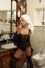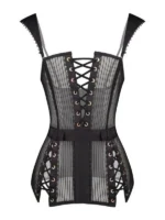 “Obsidian Grace” komplekt, kus sensuaalsus kohtub keerukusega. Keeruliste paelte ja läbipaistvate paneelidega kaunistatud korsett rõhutab teie figuuri kütkestava võluga. See komplekt koos elegantsete varrukatega, mis lisavad salapära ja sobivad aluspüksid, loob võimsa ja vastupandamatu silueti. Ideaalne nendeks hetkedeks, mil soovite tunda end nii enesekindlalt kui ka ahvatlevalt, “Obsidian Grace” on teie jaoks unustamatu õhtu.