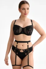 Emma pesukomplekt ühendab pehmete korvidega tugikaartega balkonett rinnahoidja, sobivas lõikes püksid ning dekoratiivsed rakmed. Rinnahoidja korvid on valmistatud lillemustriga tikandist ja õhulisest tüllist, alumine osa ja selg on kergelt läikivast satiinist, mis aitab komplektil hästi hoida oma kuju. Püksid kordavad sama materjalikeelt ning on viimistletud nii, et need istuvad hästi ega joonistu riiete alt välja. Komplekti täiendab dekoratiivne rakmete detail, mis rõhutab vöökohta ja seob kogu koosluse ühtseks tervikuks. Emma pesukomplekt sobib nii igapäevaseks kandmiseks kui ka hetkeks, kui soovid midagi läbimõeldumat ja elegantsemat.