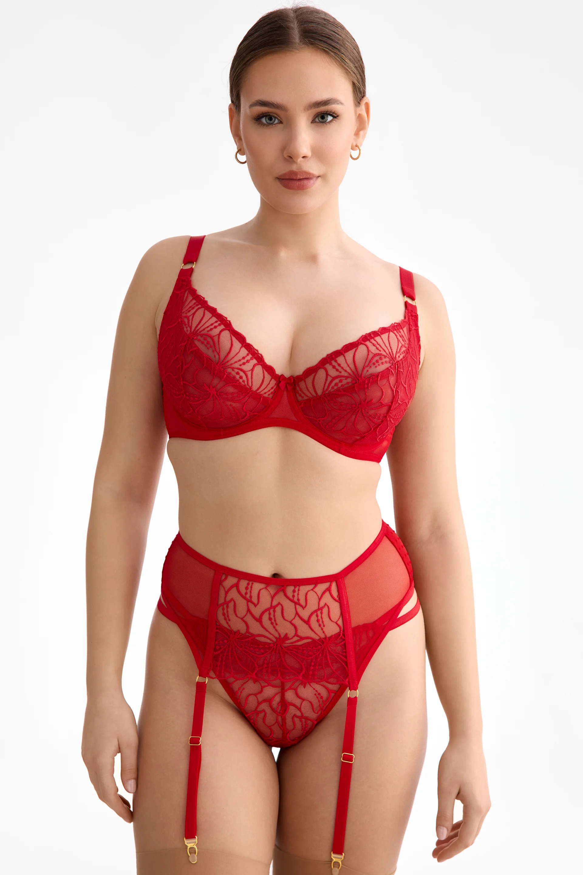 Harper pesukomplekt ühendab sügava punase tooni ja suurejoonelise lillemustrilise tikandi. Tugikaartega rinnahoidja pakub tuge ja hoiab rinna kuju ilma polsterduseta, tuues esile loomuliku vormi. Korvid on valmistatud rikkalikust tikandist, millele lisab kergust pehme, täpiline ja läbikumav materjal külgedel ja seljaosas. Komplekti püksid on samas stiilis, rõivaste all märkamatud ning loovad terviku, mis mõjub läbimõeldult ja sensuaalselt. Kõrge pihaga sukahoidja seob komplekti elegantseks tervikuks ning on mõeldud kandmiseks koos sukkadega. Kuldsed, niklivabad detailid lisavad sooja ja pidulikku aktsenti.