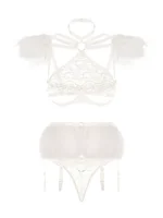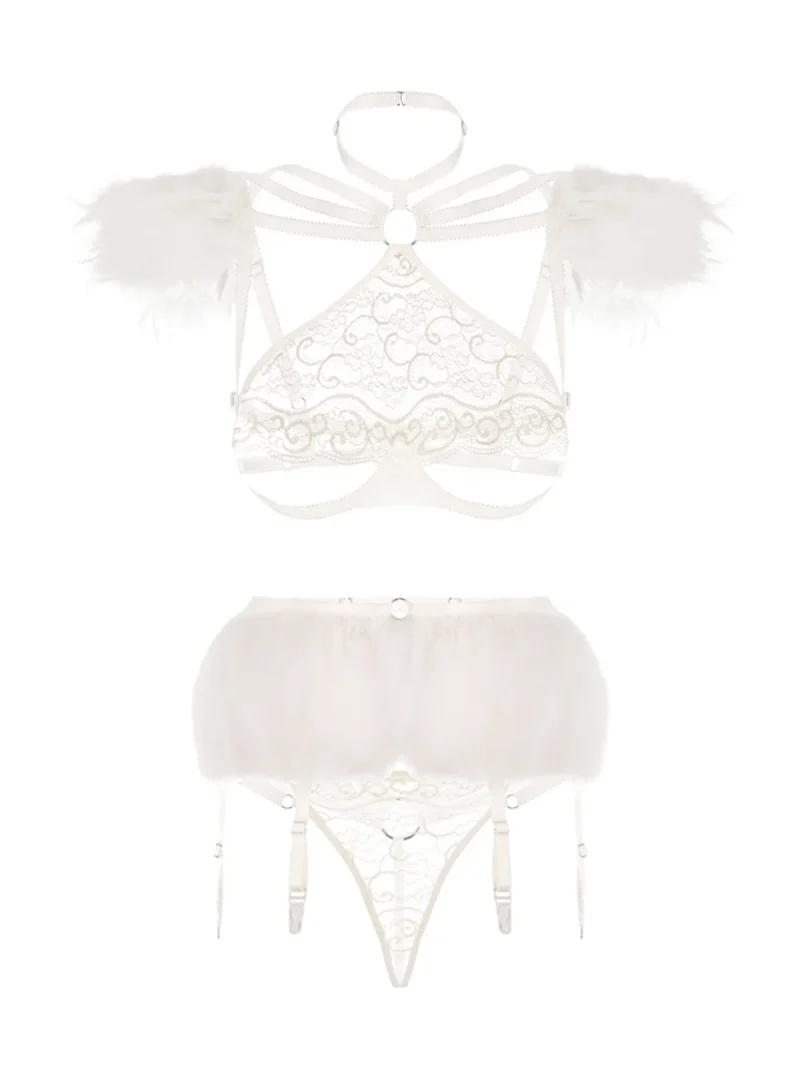 Valge pitsikomplekt Valge Ingel rõhutab kõiki teie figuuri eeliseid. Komplekti täiustavad naturaalsed suled. “Taevast langenud inglile” on võimatu vastu panna🖤