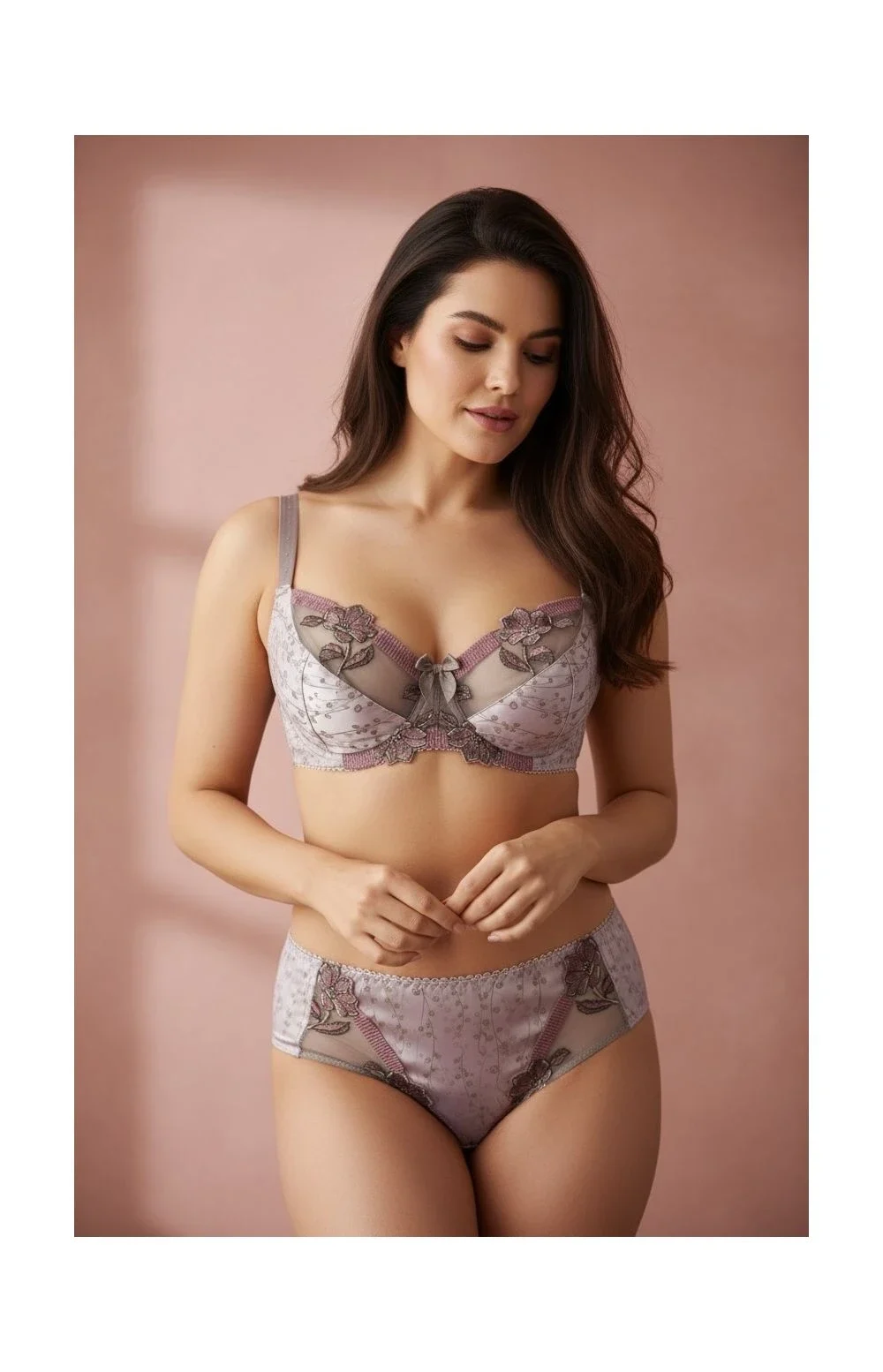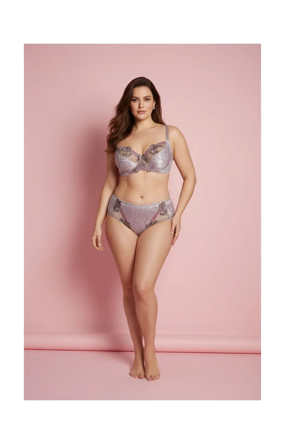 Crépuscule maxi-lõikega püksid on valmistatud pehmest Itaalia satiinist, mis jääb nahal siidine ja langeb ühtlaselt. Tikandiga violetroosa tüll lisab kergust, kuid säilitab materjali kvaliteetse ja luksusliku tunde. Kõrge piht tagab täieliku katvuse ning loob tasakaalus silueti ilma liigse surveta. Servad on viimistletud peene sakilise äärega, mis lisab naiselikkust, kuid ei muuda üldmuljet raskeks. Puudriroosa põhi koos khakiroheliste detailidega loob küpse ja läbimõeldud värvilahenduse.