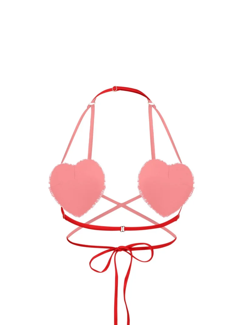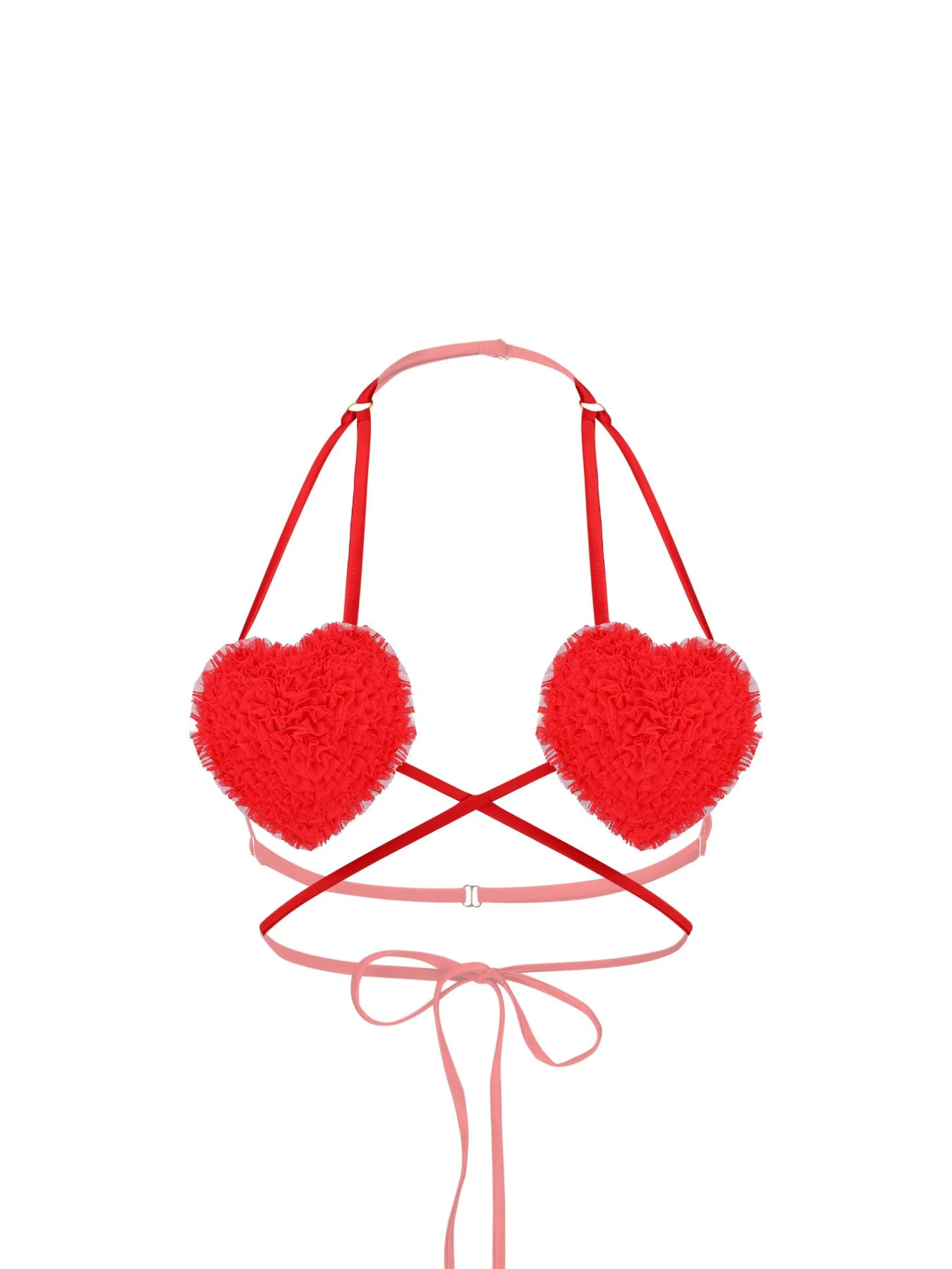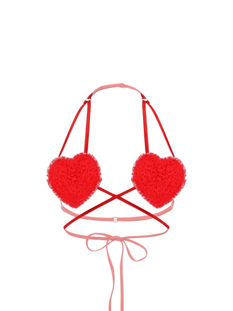 Double Heart rinnahoidja on valmistatud siledast punasest satiinist, mida täiendab kerge võrkdetail. Südamekujulised korvid on tekstuurse viimistlusega ja loovad visuaalse fookuse, jäädes samas kehal pehmeks ja painduvaks. Reguleeritava pikkusega rihmad võimaldavad kohandada istuvust vastavalt kehale. See on rinnahoidja hetkeks, kus soovid midagi erilisemat, kuid mitte ülepingutatud – detail on nähtav, tunne jääb rahulik.
