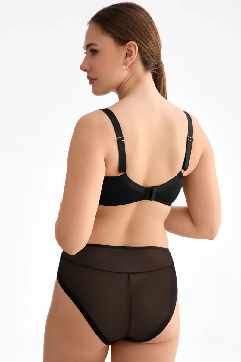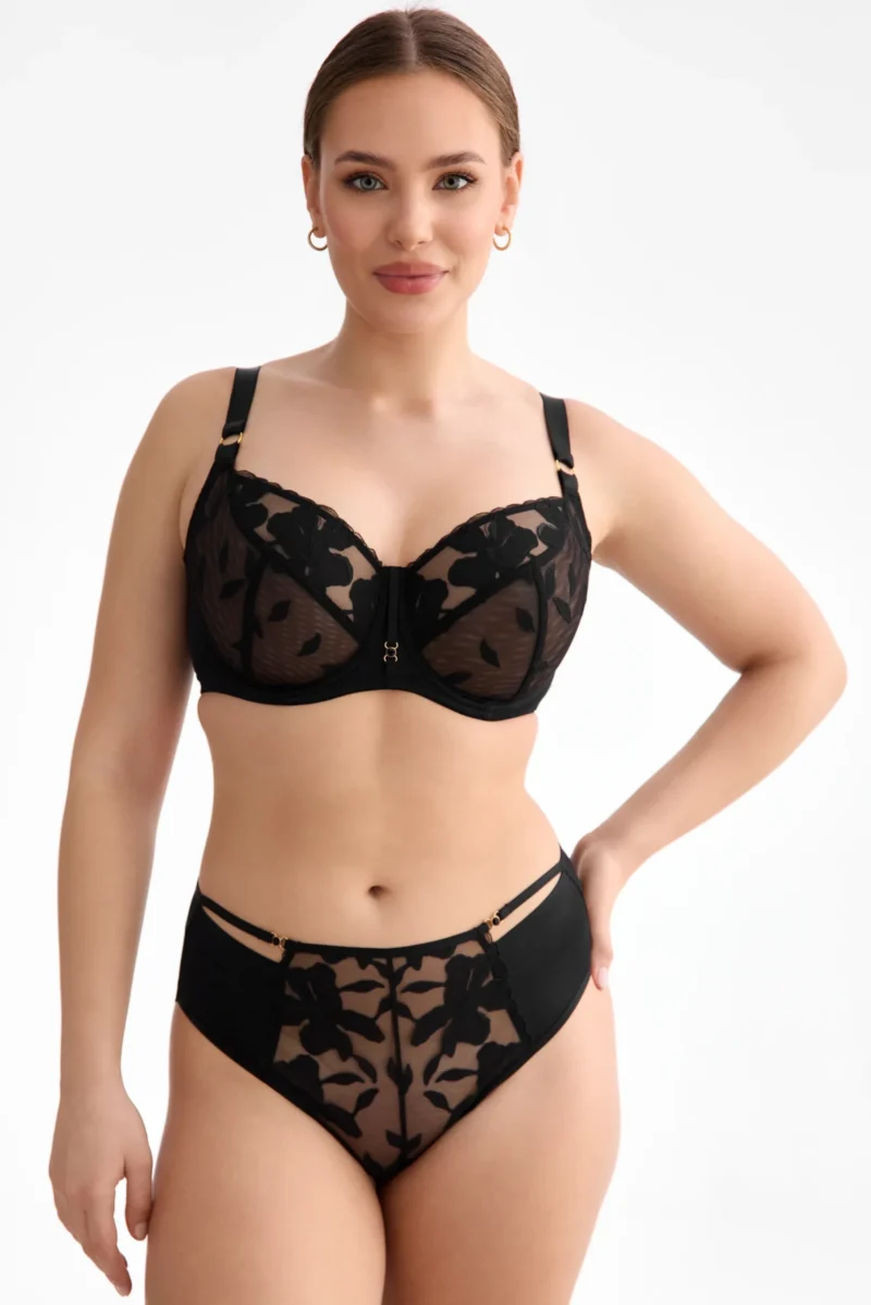 Emma kollektsiooni rinnahoidja on pehmete korvidega ja tugikaartega, pakkudes head tuge ja loomulikku vormi. Korvidel on kaks lõiget – üks vertikaalne ja teine diagonaalne –, mis aitavad rinnal kaunilt esile tulla ja toetavad istuvust. Kõrgem keskosa katab rinda rohkem ning sobib hästi igapäevaseks kandmiseks. Korvid on valmistatud tikandist suuremõõtmelise mustriga, mis annab disainile sügavuse ja graafilise ilme. Seljaosa ja alaosa on elastsemast, kergelt läikivast satiinilaadsest materjalist, mis lisab komplektile pehmust ja elegantsi. Rinnahoidjal puuduvad küljetoed, õlapaelad on reguleeritavad, kuid mitte eemaldatavad. Keskosa kaunistab metallist detail. Seljakinnitus on haak-kinnitusega ning reguleeritav vastavalt suurusele kahe või kolme astmega. Niklivabad kollakas-kuldset tooni metallosad lisavad viimistletud ilmet.